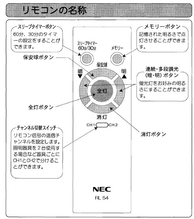 NEC 照明器具用リモコン RL54 ■特徴 本商品は照明器具用補修部品です、適合器具にてご使用ください。