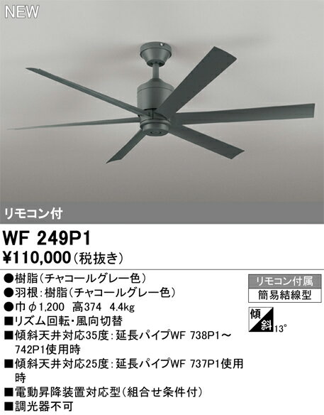 商 品 詳 細商品名オーデリック インテリア 屋内 照明メーカー名オーデリック ODELICメーカー器具名称シーリングファン(天井扇)仕様【シーリングファン本体】 ● 樹脂(チャコールグレー色)● 羽根:樹脂(チャコールグレー色)● 巾f1,200 高367 4.3oリズム回転・風向切替傾斜天井対応35度(別売延長パイプWF 738〜742使用時)電動昇降装置対応型(組合せ条件付)調光器不可 【灯具】 LED電球一般形9.8W×6(E26)ランプNo.245A鋼(チャコールグレー色)巾Φ253-500 高142-190 2.9kg光源寿命40,000時間 / シーリングファン灯具WF 247・249専用 / 連続調光100-10%ファン本体と組合せてリモコンをご使用ください受光部カバーは組合せ本体に付属しています注意事項◆写真方向以外取り付け不可 ※施工・電気工事は専門業者にご依頼ください。