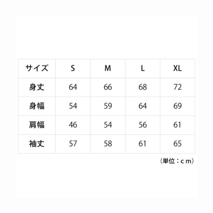 サイズSMLXL身丈64666872身幅54596469肩幅46545661袖丈57586165(単位:cm)出荷の目安:5営業日以内【こちらの商品は「お取り寄せ品」です】お取り寄せ品は、ご注文後に納期の変更や欠品のご連絡を差し上げる場合がございます。